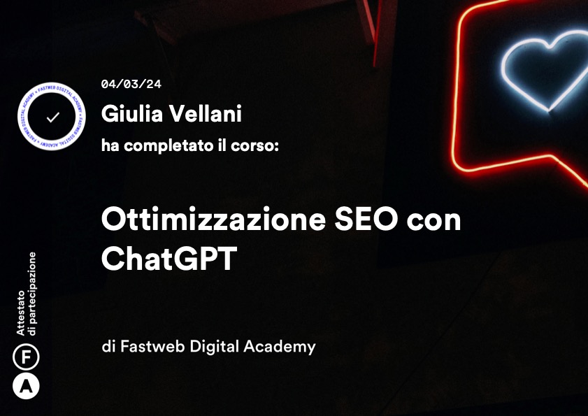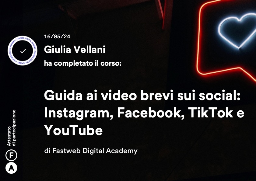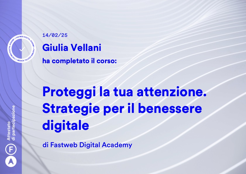 Attraverso i corsi della Fastweb Digital Academy sto accrescendo le mie competenze professionali in ambito di storytelling, story&content, digital marketing strategy.